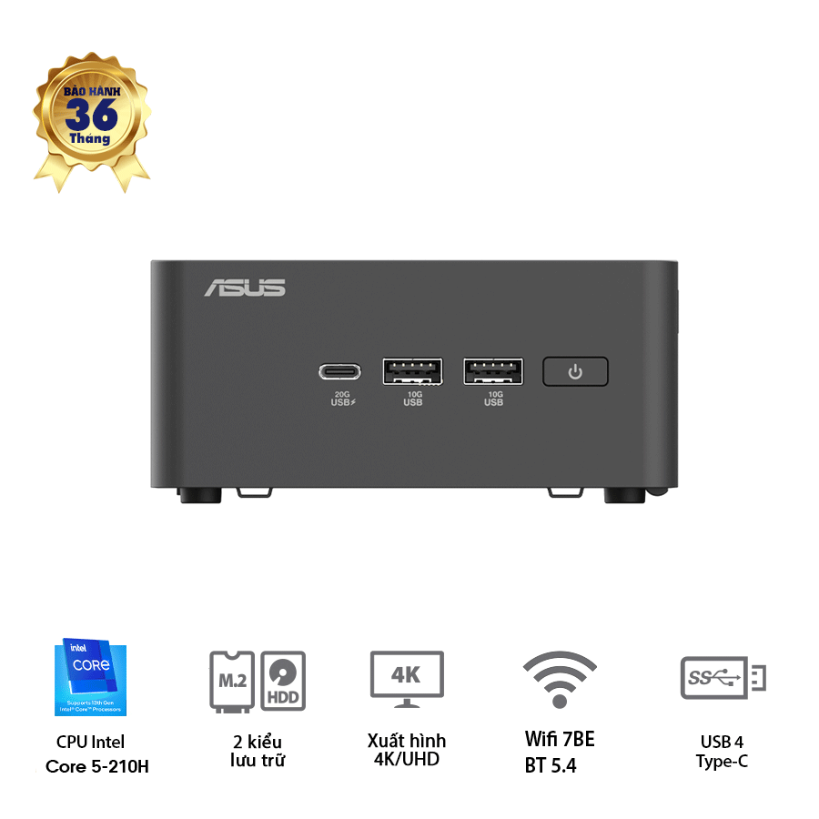 ASUS NUC15 PRO Tall, Core 5-210H, 2xDDR5-5600 (up to 96GB) (Sodimm), 1x 2280 NVMe (up to 8TB), 1x 2242 NVme (up to 2TB), 1x 2.5 SATA (up to 4TB), Intel Arc 140T, 2x HDMI 2.1, 2x Thunderbolt 4 Type C, 3x 3.2 USB Type A, 1x 2.0 USA Type A, 1x RJ45, VESA MOU