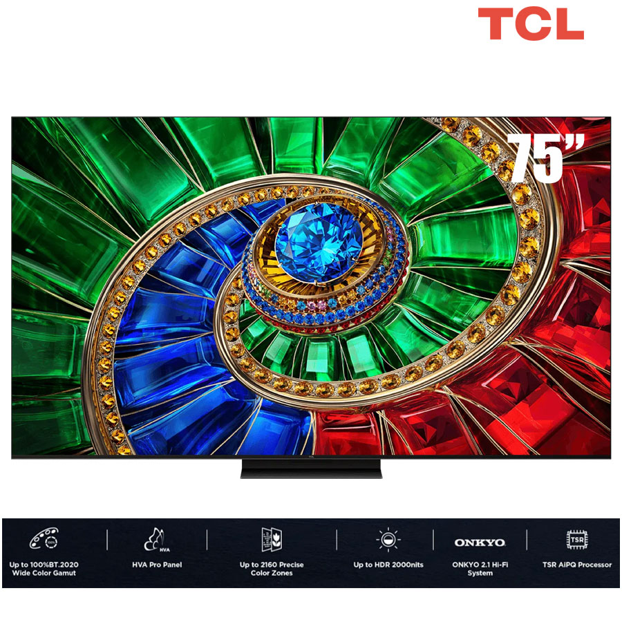 TV TCL 75-inch RGB- Mini LED 4K75RM7L HVA Panel 144 Hz - Google TV; Bộ xử lý AiPQ Pro,100% BT.2020 Ultra-wide Color Gamut; Bộ xử lý TSR AiPQ Processor,, Loa ONKYO 2.1(50-60W) Hi-Fi System, AiPQ Pro Processor, Slim & Unibody, 2000 nits